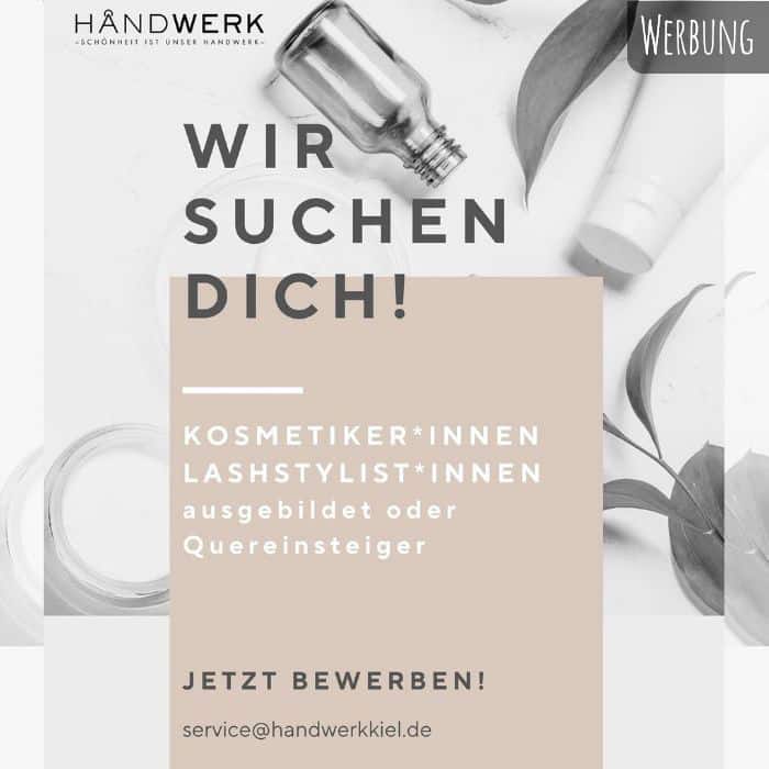 Du liebst Beauty, bist teamfähig, flexibel und bereit, Neues zu lernen? Dann komm in unser Team! Wir suchen ab sofort Verstärkung (Minijob/ Teilzeit/Vollzeit)! Egal ob Quereinsteiger/in oder ausgebildete Kosmetiker/in – bei uns bist du herzlich willkommen. Wir freuen uns auf deine Bewerbung an service@handwerkkiel.de